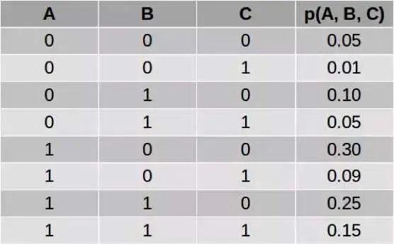 我们可以怎样计算上式中的分子和分母呢?让我们用一个简单的例子进行说明。考虑一个有三个变量的网络,其联合分布定义如下:
