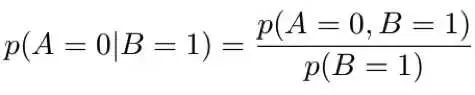 假设我们想计算 p(A|B=1)。注意这意味着我们想计算 p(A=0|B=1) 和 p(A=1|B=1),这两个值的和应该为 1。使用上面的等式,我们可以写: