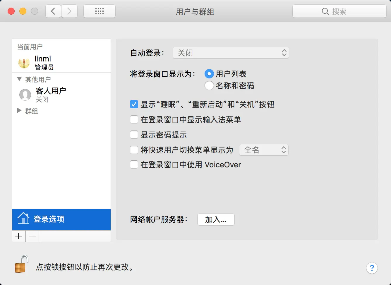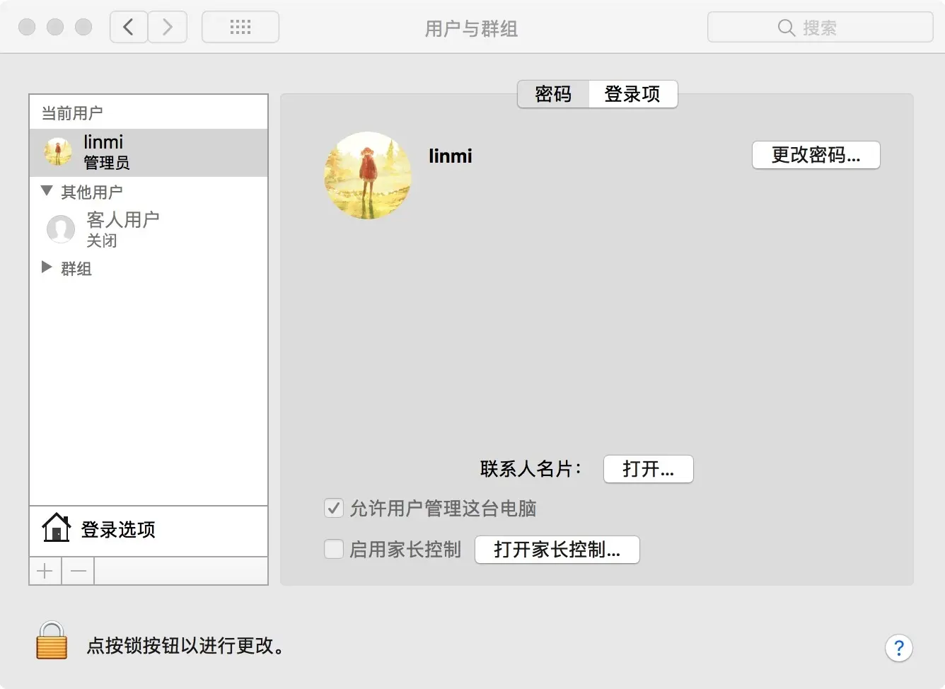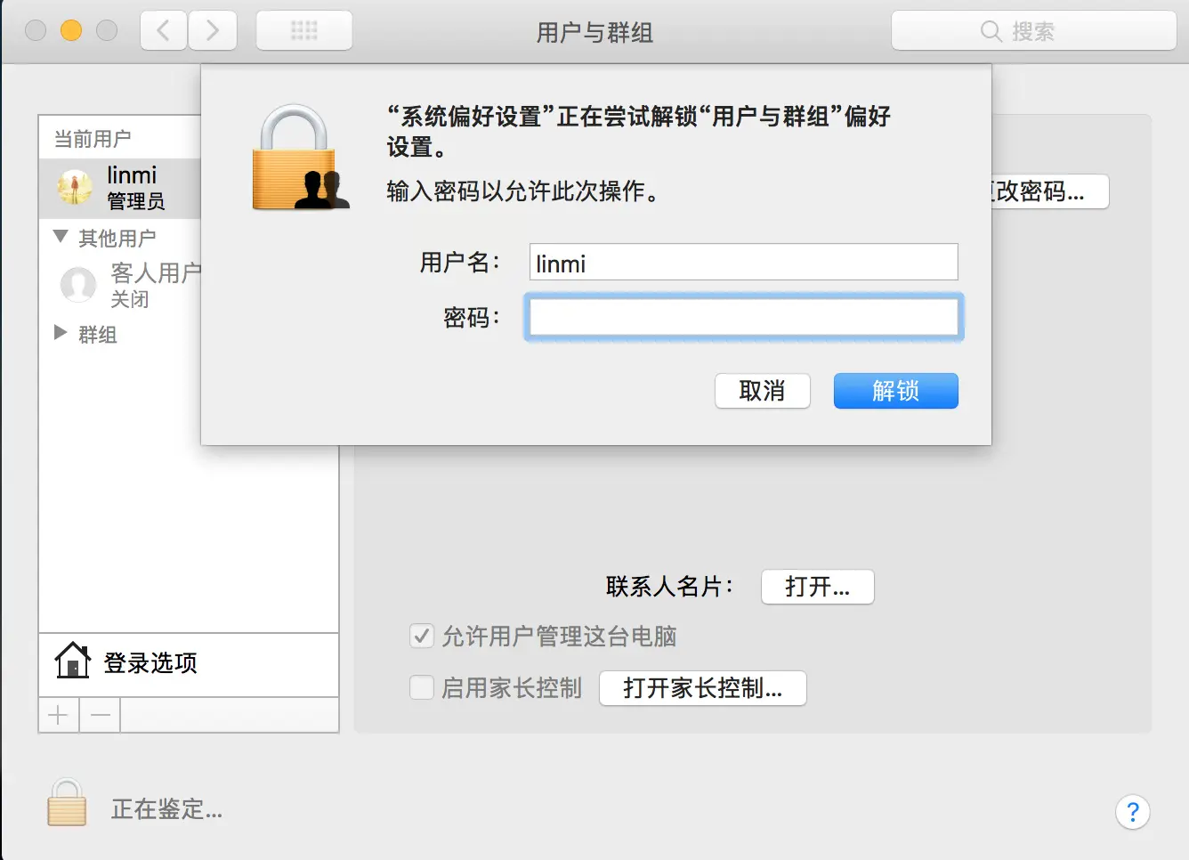 首先,打开系统偏好设置。然后进入用户&群组,点击左下角小锁。就可以在用户名中输入 Root,密码空着。最后点击解锁,这样就可以获得添加全新管理员账户的权限了。