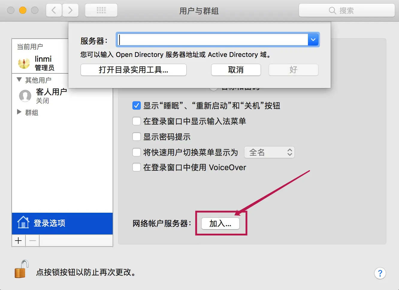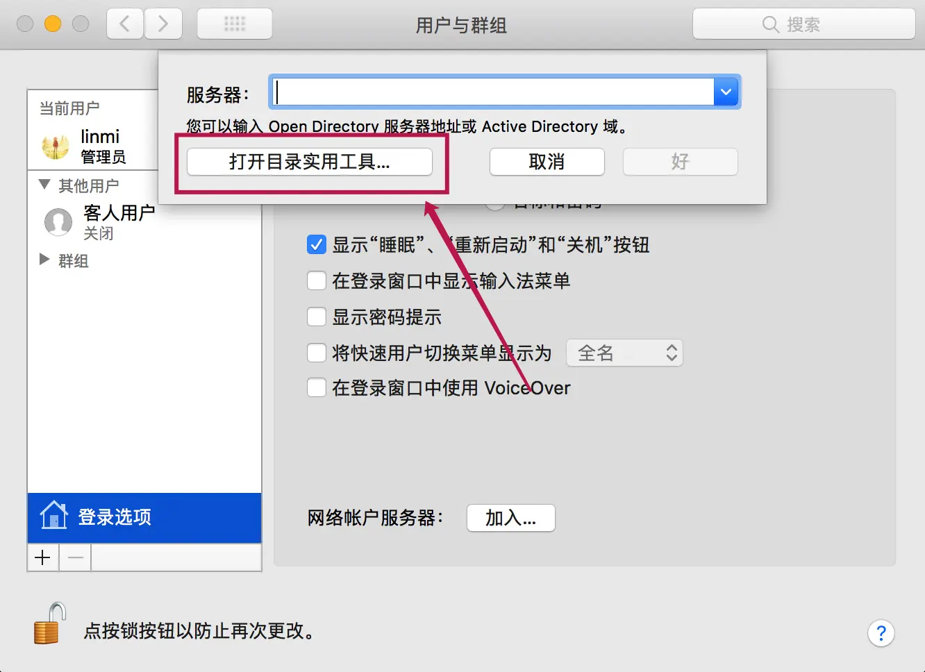 - 点按“目录实用工具”窗口中的 锁形图标,然后输入管理员名称和密码。