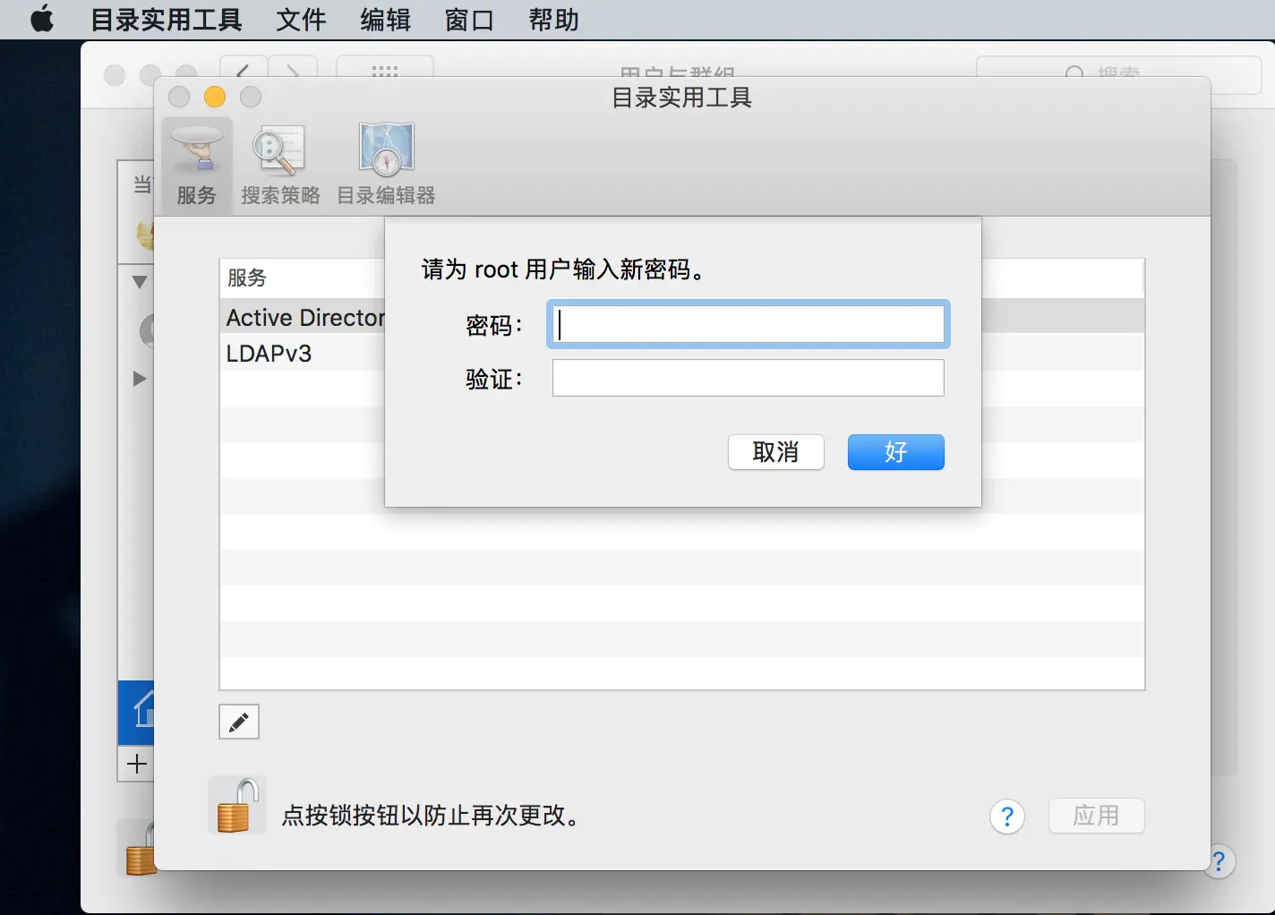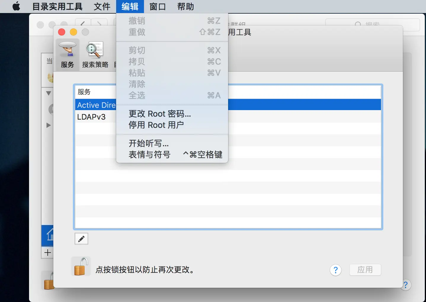 - 从“目录实用工具”的菜单栏中,选取“编辑”>“更改 Root 密码…”