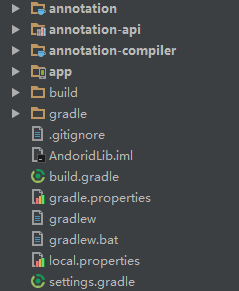 annotation:(java lib) 提供注解。 annotation-compiler:(java lib)注解处理。 annotation-api:(Android Lib) 是我们外部用到 api。 app:是调用api进行测试的。