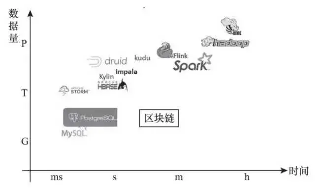 图 4-5 以时间、数据量为坐标轴,列出了目前大数据引擎大致擅长处理数据的范围,区块链可在其中成为一种很好的补充。