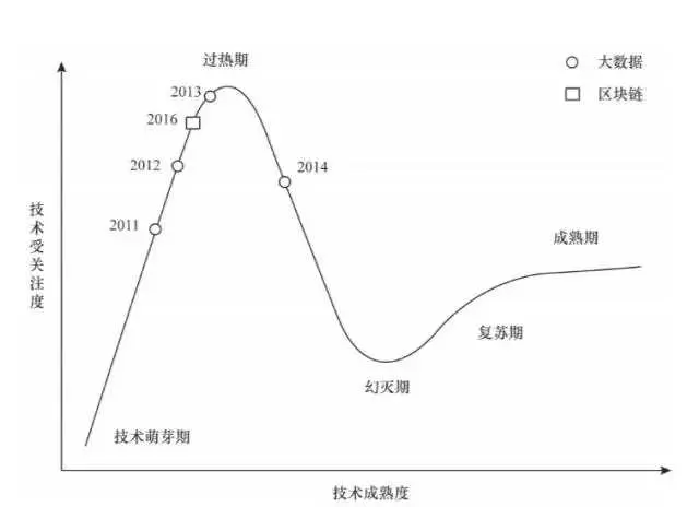 图 4-4 大数据与区块链在高德纳历年技术成熟度曲线中的出现情况