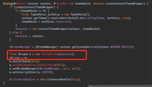 AlertDialog构造方法里面最后执行的是这个构造方法,这里找到了亮点:1、mWindow是啥?是不是PhoneWindow?首先AlertDialog是继承Dialog的,mWindow就是Dialog里面初始化的对象,看看是不是PhoneWindow,如果是,那么就可以猜到通过在PhoneWindow添加View就可以在Activity上展示了,因为经过上面分析Activity是跟PhoneWindow有关联的。带着问题继续分析源码: