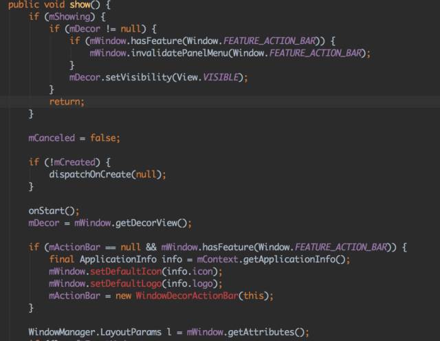 WindowManager是主角。在Dialog build之后就将View设置进来了,继续追踪Dialog show()这个方法,这个方法会将View与Window相互联系: