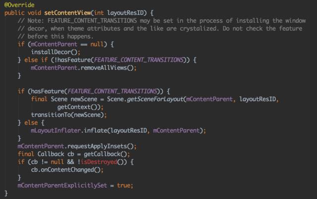 这里的 mContentParent 其实是一个 ViewGroup。这么看来就简单了。PhoneWindow里面包含了一个ViewGroup,setContentView其实就是将layout设置到了这个ViewGroup上了。