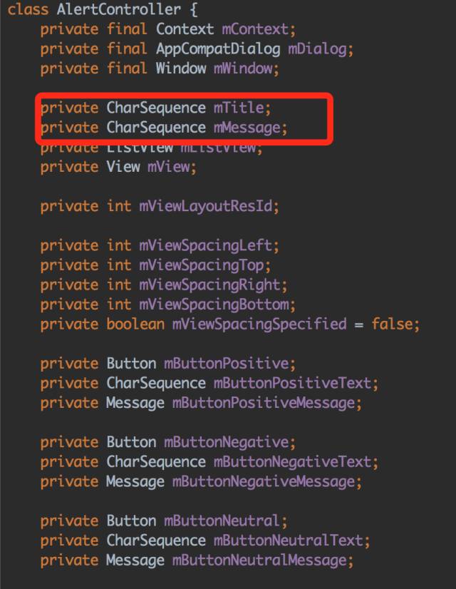 从这两个属性就知道了,设置Title、Message的。用过Dialog的人都知道他们是啥,就不多说了。