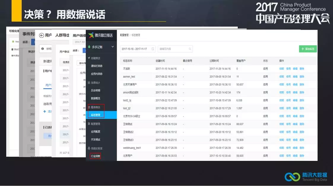 这些都是产品经理在做决策和做运营中非常重要的。我们甚至可以把核心用户群导出到广告,当你了解到这些信息的时候,还可以把这种精准推荐的技术也运用到消息推送里面,这就是我们的信鸽推送。