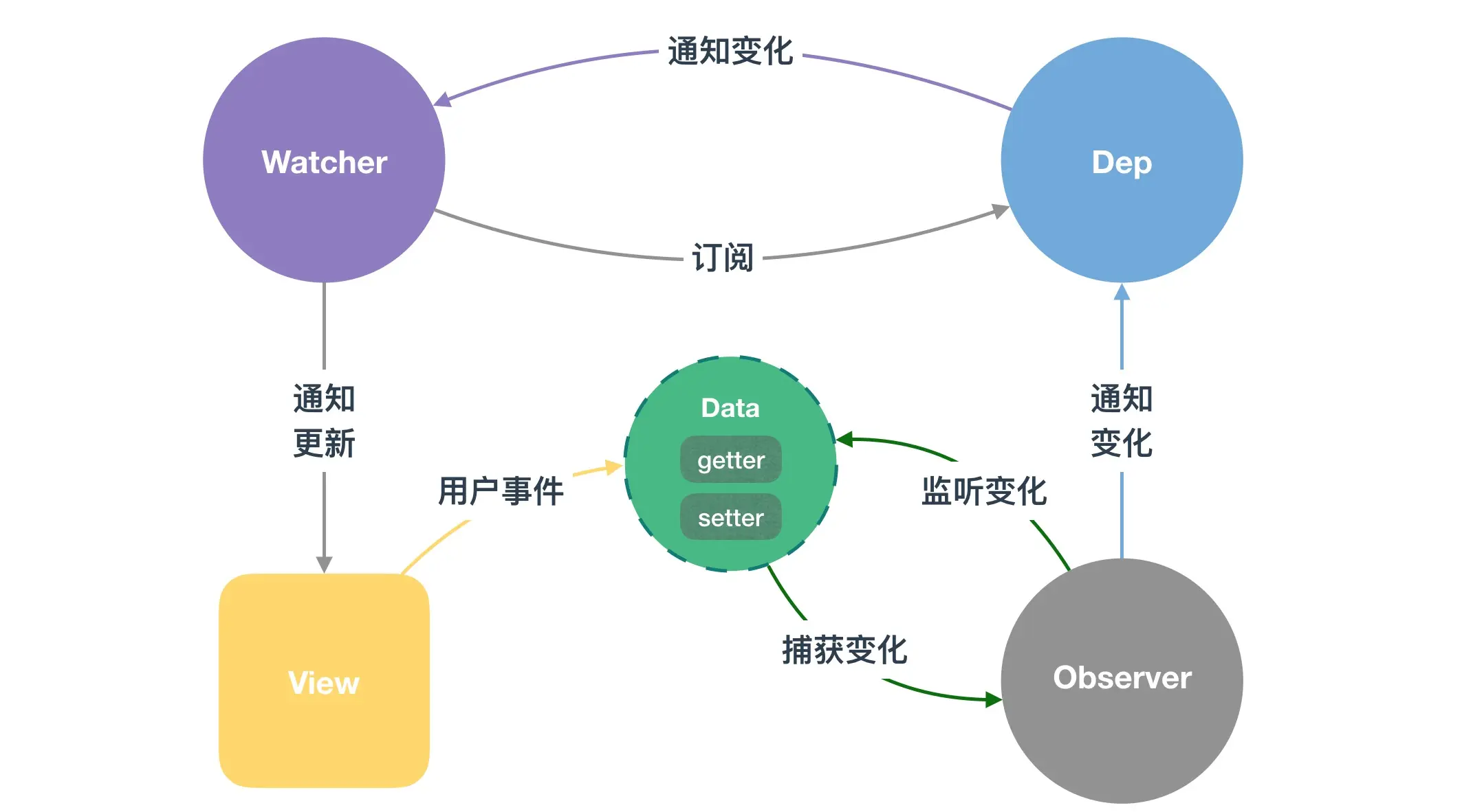整个过程中主要涉及了 Observer、Dep 和 Watcher三个类,相关源码(已精简)如下:
