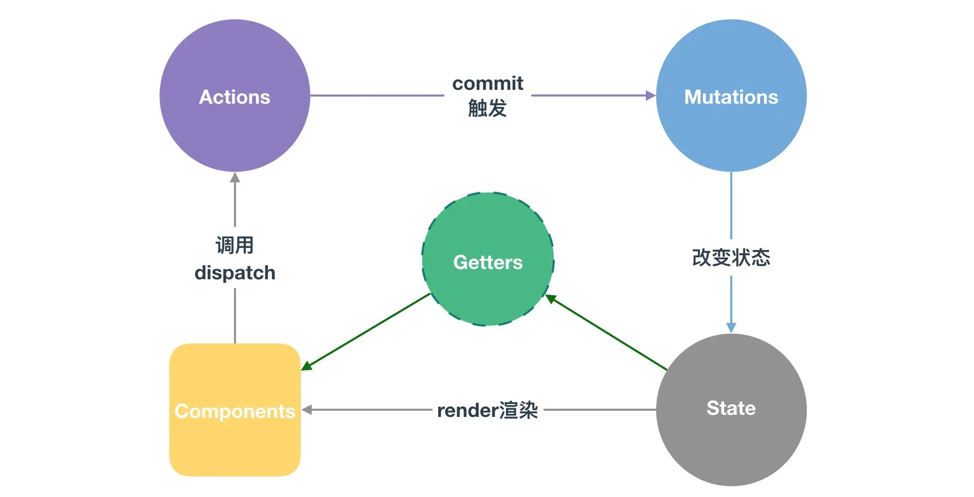 - 视图层中的 Components 通过 this.$store.xxx 或 getters 方法从 state 中获取数据并渲染;