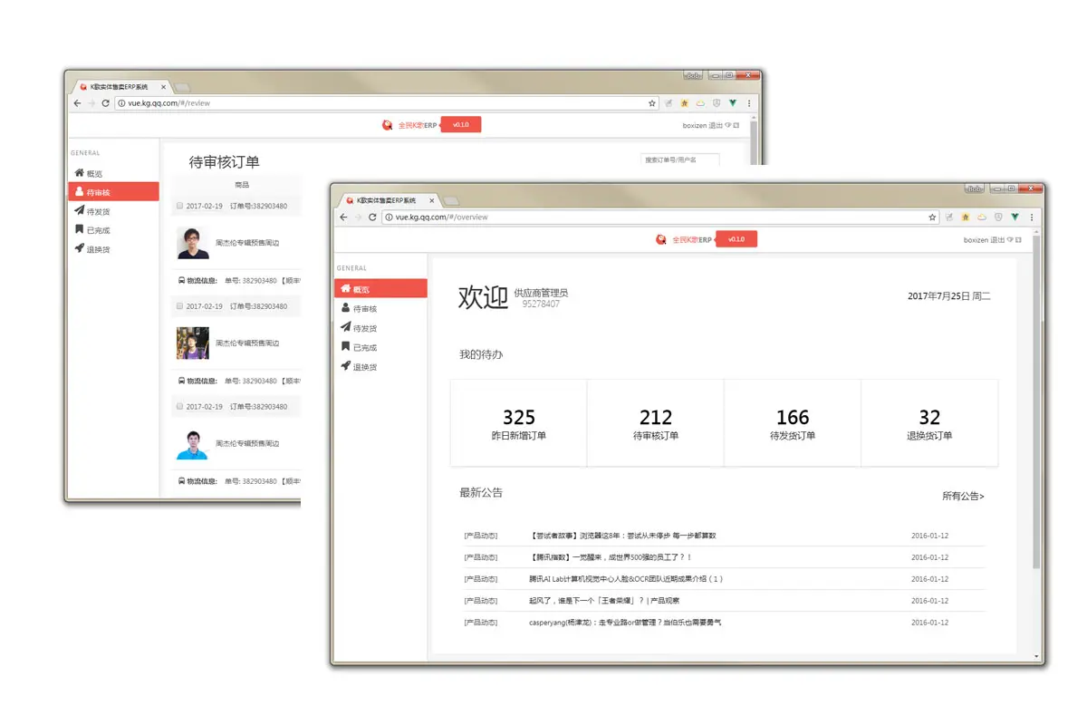 全民K歌初期在试水麦克风售卖活动中取得了良好的市场反馈,为继续推动周边实体的售卖,现在期望搭建一个属于自己的售卖平台。整个需求分为H5和PC两部分,其中H5为用户购买实体周边的入口,PC则是对用户的订单数据进行管理。本项目为需求中的PC部分,共由订单数据概览、待审核、待发货、已发货和退换货五页组成。