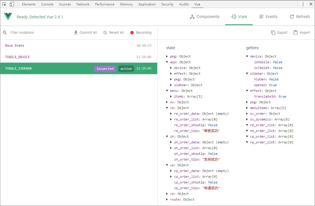 对于开发过程中 Vuex 状态的追踪,可以通过 Vue Devtools 的 “Vuex” 一栏进行查看,如上图所示,安装方法可以自行搜索。