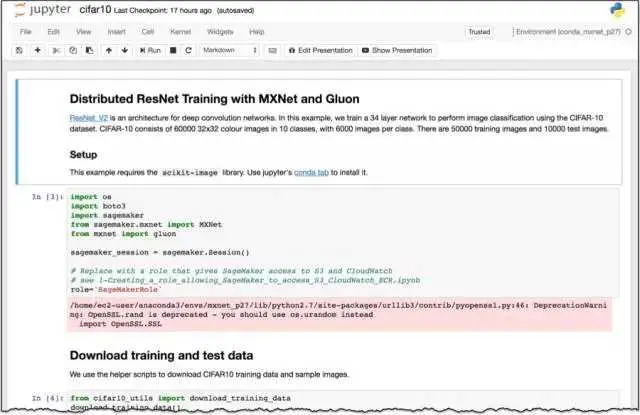 作为示例,这里假定我们需要构建、训练并部署一套基于 Apache MXNet 的图像分类器。这里我们使用 Gluon 语言、CIFAR-10 数据集,外加 ResNet V2 模型架构。