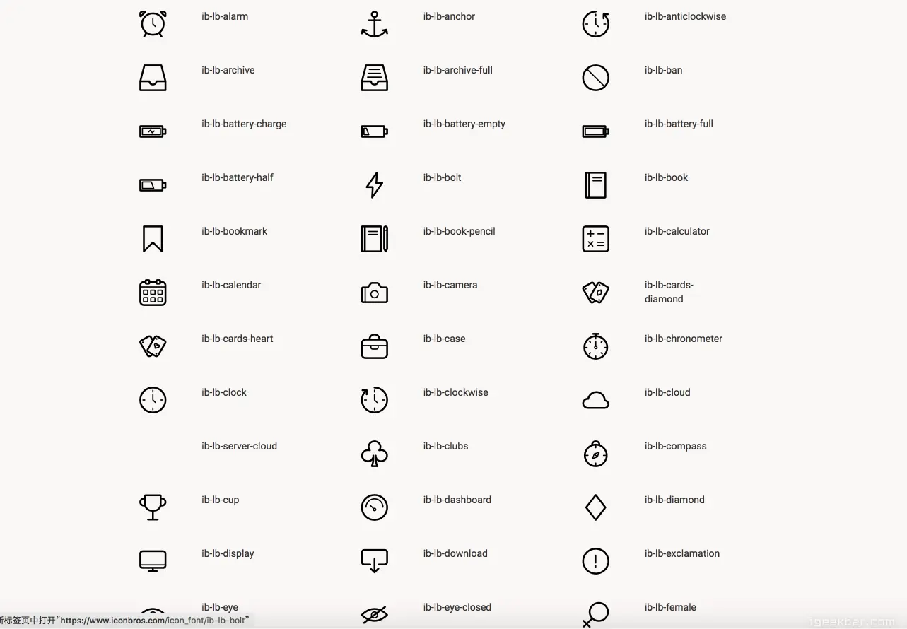 如果你要使用于网页中,或许通过加载字型方式来取用图案会更快、也减少对服务器的请求数,刚好 IconBros 也提供了网页字型Linear Basic Font,从选单Font Collections就能找到。下载后解压缩可以找到 icons-reference.html 索引参考范例,即可查看如何使用~