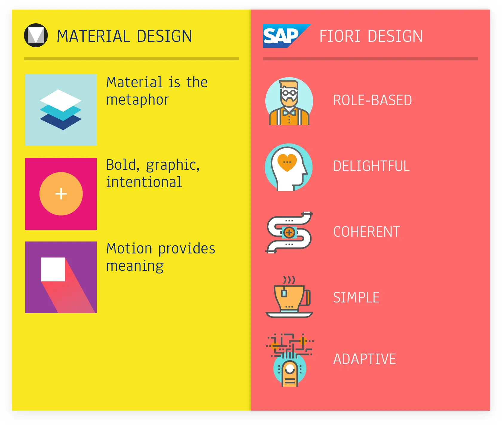 上图右侧是 SAP 的 Fiori Design,它强调的基于角色、愉快的、一致连贯的、简单和适应的。如果你对 SAP 的业务有一些了解(甚至是它的用户),你应该不难理解这些关键词对于 SAP 用户的重要性。这些关键词与 SAP 的业务特性有着非常密切的关联,甚至说做不好这些点他们的用户将不会愿意继续选择他们的产品。
