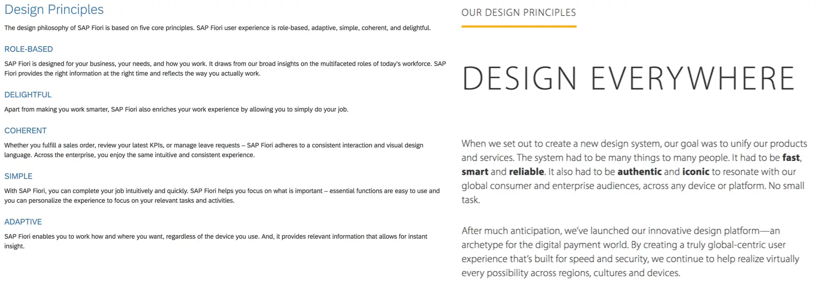 Visa(上图右)在其新发布的 Design Systems 中提出了「Design Everywhere」的理念。作为一个国际化的产品,如何在全球用户的不同设备上快速、安全的完成支付、资金管理操作是他们最为重要的目标和方向。而 SAP 作为企业内部解决方案提供商则更关注于角色、操作的连贯性等目标。