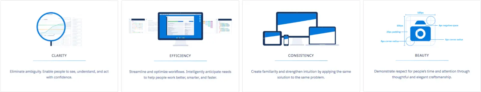 最好的案例就是 Salesforce 的 Lightning Design System。Lightning 的 Principle 是清晰、高效、一致、美观,但对于这四个关键词他们定义了优先级,美观不能超越效率和一致性、清晰甚至成为他们绝对第一的关键词。