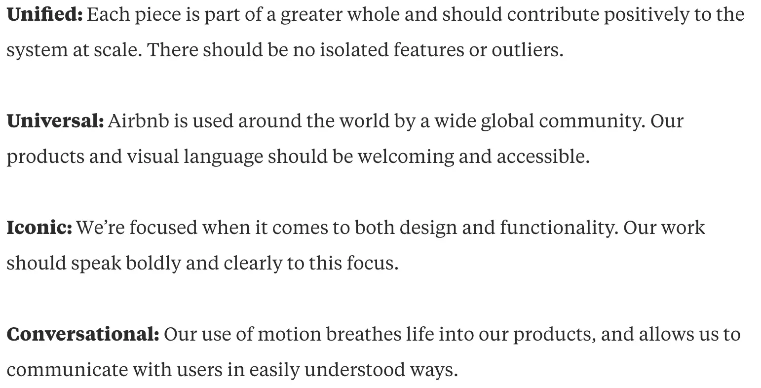 Airbnb 的 Principles 是(Unified、Universal、Iconic、Conversational),这个原则深深的植入了他们每一个设计中。每次涉及到新组件的设计,他们都会将这些关键词带入到设计中,看看自己的设计是否满足 Principles 的要求。