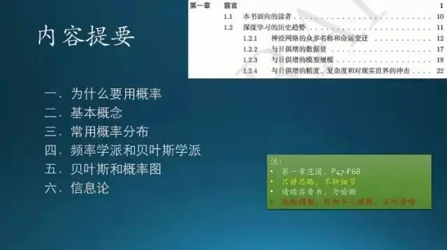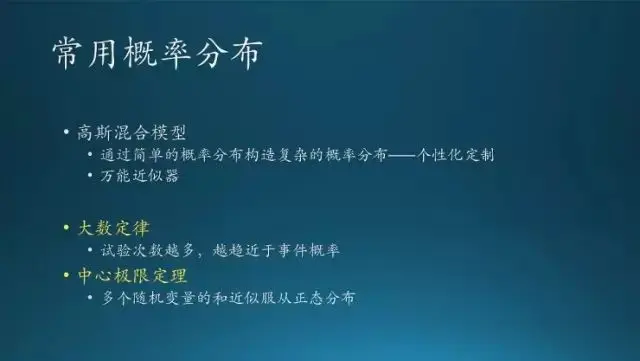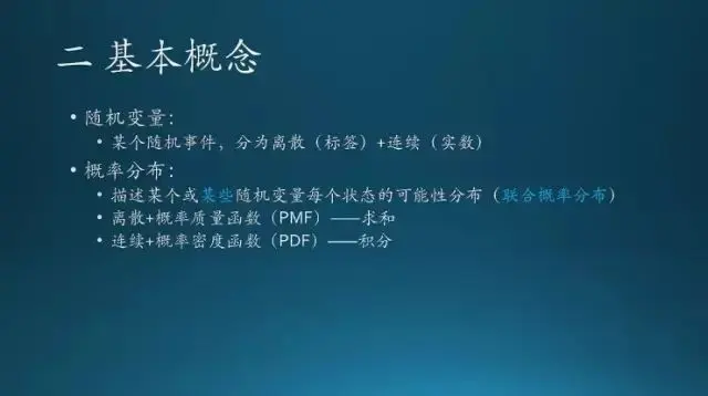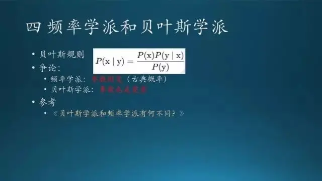这节课会讲到一些基本概念,常用的分布,频率学派和贝叶斯学派的差别,还有贝叶斯规则,概率图,最后是信息论。这里第四条可能很多人可能头一回见到,学了那么多概率,连这个都不知道,那你的概率真的白学了,真这样,不开玩笑。不过,老实说我也是前几年才知道这个学派的差别,因为浙大三版教材上就没提到这些,好像就提到一点,频率学派就是古典概率,没有什么其他的,这也是现行教材的缺陷。