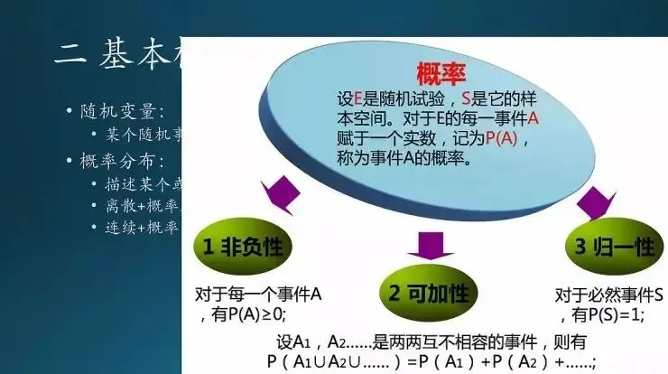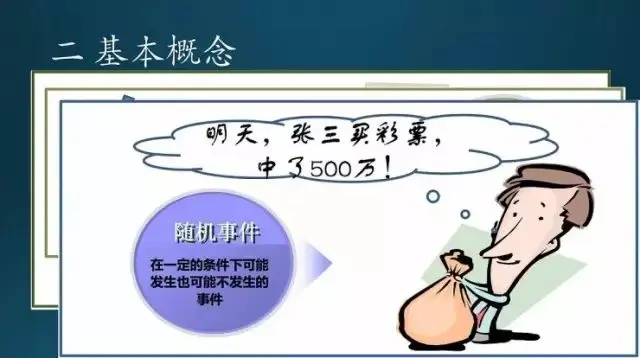 事件有几种分类。必然事件,太阳从东边升起西边落下是必然的;不可能事件,1+1 不可能不等于 2(这个不要钻牛角尖,这方面的段子很多,千万别跟我说陈景润证明 1+1 不等于 2,我跟你急);买彩票中了五百万,这个概率是非常小的,即小概率事件。小概率怎么度量呢?就是正态分布里面三倍标准差以外,跟那个μ±3δ相关。