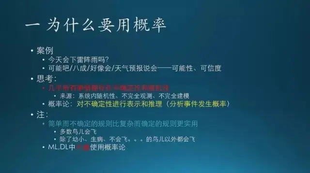 概率就是对不确定性的事件进行表示和推理。书里面提到一点,就是往往简单而不确定的规则,比复杂而确定规则更实用,这个怎么理解呢?像第一句话,多数鸟儿会飞,这个好理解,但是其实第一条很不严谨,因为它有很多情况,有些鸟本身就不会飞(企鹅、鸵鸟),有些幼小、生病也不会飞;如果严谨一点,表述成下面 “除了什么。。。什么。。。以外的鸟儿都会飞”,听着都累。这就是简单而不确定的规则比复杂而确定的规则更实用。