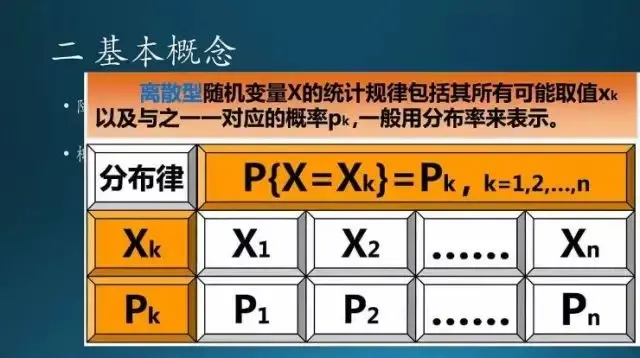 这是离散型的概率分布,X 这个事件取得 X1、X2 等等情况的可能性。这是离散概率分布,如果是连续的话就变成积分的形式了。