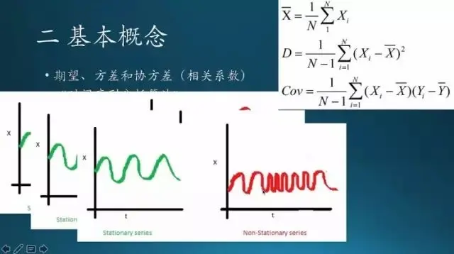 还有一个叫协方差,自己跟自己比的话,每一次变化的周期要一致。像这个红色序列前面周期比较长,后面周期变短,然后又长了,它的周期就一直在变化,这个也是不稳定的。