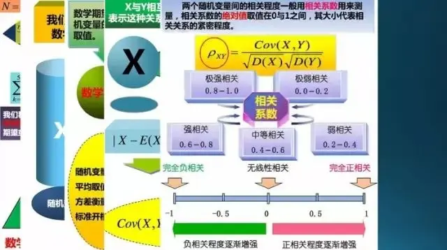 这个是相关系数,就是用的协方差,然后除以它的两个方差 D(X)D(Y);如果相关系数在不同的取值范围,表示有不同的相关度。0 就是完全没有线性关系,-1 是完全负相关,1 是完全正相关;这都是指线性关系。