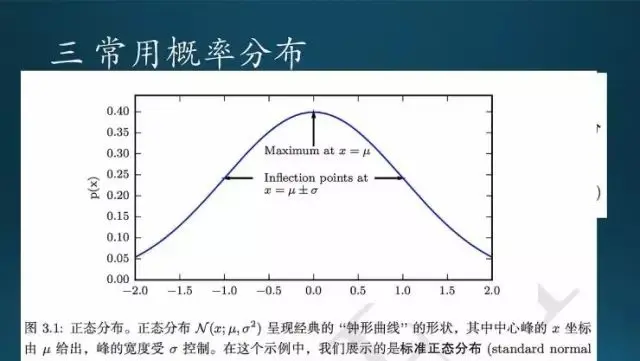 常用的概率分布,均匀、伯努利;范畴分布里面就不再是一个值,而是多个值,实验一次有多种结果,相当于扔的是色子,而前面扔的是硬币,那么硬笔只有两种取值;还有高斯分布,也叫正态分布。