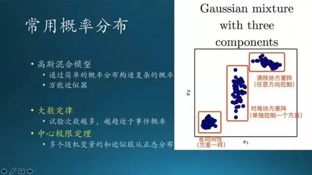 书里有个高斯分布分布,就是说刚才提到的分布都比较简单,我们能不能把它们整合起来,设计我想要的分布。这就用到高斯混合模型,这个图里面他构造了三种概率分布: