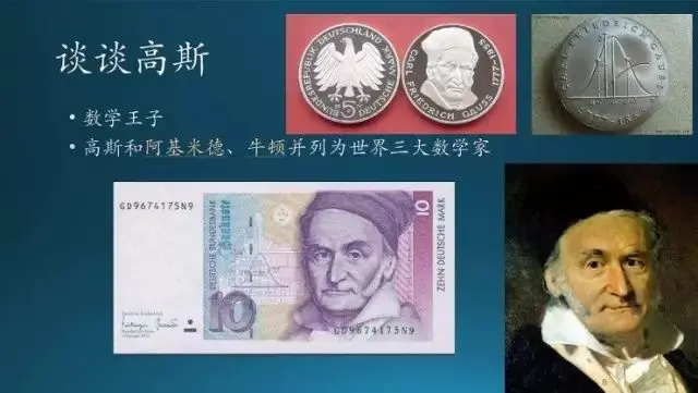 这里提几个大人物,一个是数学王子高斯,他和阿基米德、牛顿并列为世界三大数学家。德国的货币叫马克,十马克上面印的头像就是高斯,头像左边就是正态分布;硬币上也有。好像只有德国把科学家印在纸币上面,其他的国家基本都是政治人物,这也体现日耳曼这个民族的可怕。(值得学习)