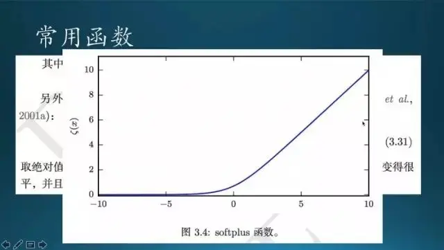 还有一个 softplus,它是 softmax 的一种弱化;softmax 从右往左下降会直接到 0,在 0 的位置有一个突变,然后继续走;0 这个点的左导数和右导数是不一样的,左导数是 0,右导数是 1,所以 0 这个点上的导数是不存在的。怎么办呢?为了数学上面好看,而且求导方便,那就把它变成 softplus,在 0 这个点做变换之后就整个平滑起来,每个点的都是可导的。实际上在书里面也提到一点,平时其实深度网络 DNN 里面会经常用到 ReLU,ReLU 里就是 softmax。softmax 是 ReLU 的一种推广。ReLU 里 0 点也是不可导的,就有一些规则的方法,就是如果到了这个点的话,他会给要么是 0,要么是 1,视具体情况而论。