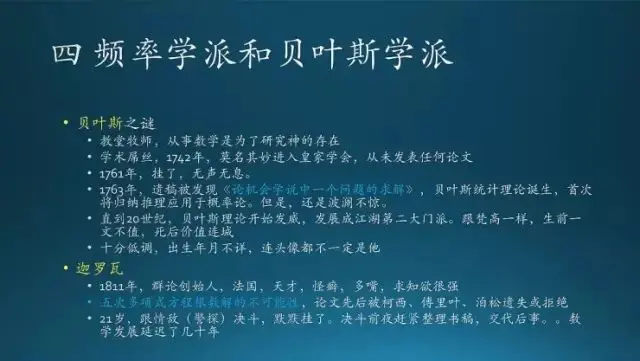 频率学派和贝叶斯学派。先讲讲贝叶斯这个人,他刚开始只是一个牧师,就是一个神职人员,滑稽的是,他做数学研究是为了研究神的存在;这个跟牛顿有点像,不过牛顿前期是不怎么研究,到老了研究上帝,最后没什么成果。贝叶斯是一个彻头彻尾的学术屌丝,在 1742 年就加入了皇家学会;当时也是有牛人给推荐了,他没有发表过任何论文,不知道怎么的就进去了;后来也挺凄惨,到 1761 年死了也没什么消息。1763 年,他的遗作被人发现「论机会学说中一个问题的求解」,贝叶斯理论就从此诞生。
