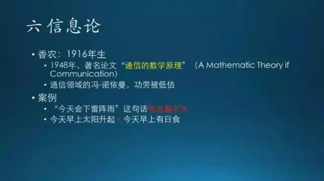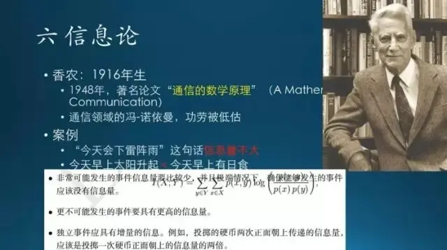 下面介绍一下信息论。信息论是香农这个人提出来的,在 1948 年他发表了一篇论文叫 “通信的数学原理”,对信息通信行业的影响非常大,相当于计算机行业的冯诺依曼这个级别。不过他的功劳一直被低估(吴军《数学之美》)。