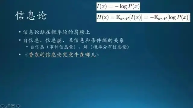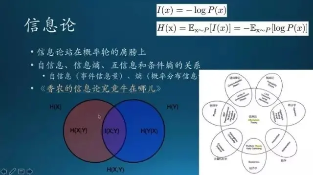 信息论主要解决什么问题呢?第一,概率是事件发生时的可能性,怎么度量信息量的大小?第二是对于某个随机事件,比如说今天下雨这句话,到底有多少什么信息量?如果是在南方的话,可能经常下雨,那信息量不大;如果在北方或者在北极,这个信息量就大了去了。还有今天是晴天还是可能下冰雹,实际上这是随机事件的概率分布,这个分布有多少信息量就用熵来衡量。上面就是自信息,有条件分布,对应的是条件熵;还有互信息等等。