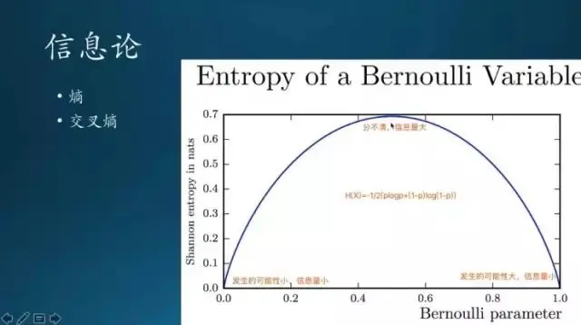这里有一个交叉熵,也是重点提到的概念。这是衡量事件发生的概率,像左侧靠近零,说明这个事件发生的可能性很小,那么它对应的信息量较少;然后到中间 0.5 的地方,比如说扔硬币有两种结果,两种结果 0.5 基本上靠猜,完全随机了;对于这样分不清到底结果是什么样的,对应的信息量最大的;类似的到另外一个极端,就是这个事件确定是可以发生的,可能性很大的,那信息量也小。