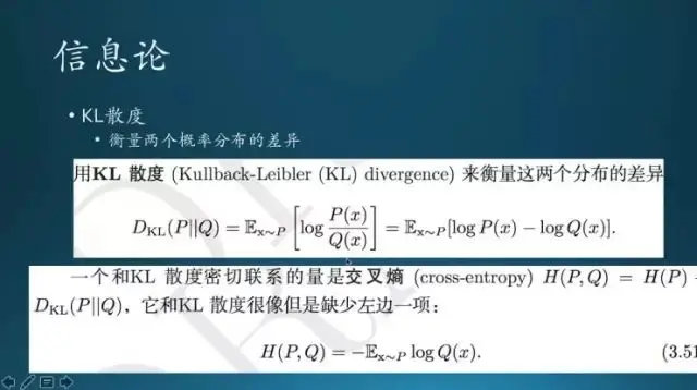这里还有一个 KL 散度,基本上是衡量两个概率分布的差异。这个公式也很复杂,你们自己去琢磨,必须要看,看一遍然后才有直观的理解。现在讲也讲不清楚。(注:信息论也可以形象起来,参考:colah's blog,Visual Information Theory)
