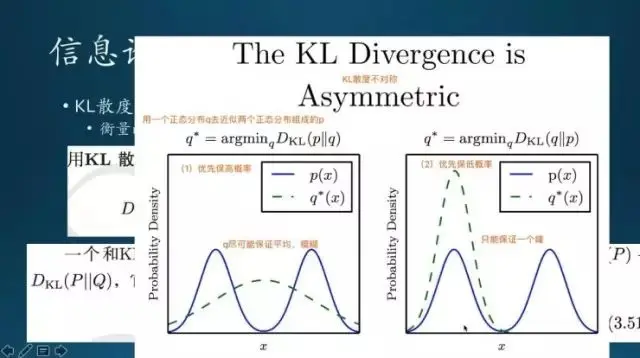 这是 KL 散度,它是不对称的,就是说概率 p 和概率 q 的顺序调一下是不同的概念,两个顺序不同要用于不同的场景。它的目标是要构造一个概率分布 q,去近似拟合、去模拟另外一个概率分布 p。这个 p 分布是由两个正态分布组合起来的,两个叠加起来。怎么用 q 拟合它呢,如果用左边的散度去度量,算分布之间的误差,这个误差对应的就是 KL 散度,然后根据 KL 散度去有方向地去调整。这是它的过程,类似于机器学习里面的过程。