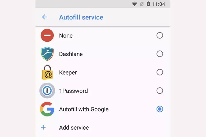 用户可以自行选择多种自动填写服务 (过程类似选择输入法)。在默认情况下,Google(服务)支持自动填写,不过用户也可以自行添加任何三方自动填写 App ,过程如下: