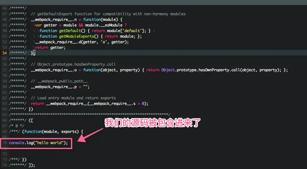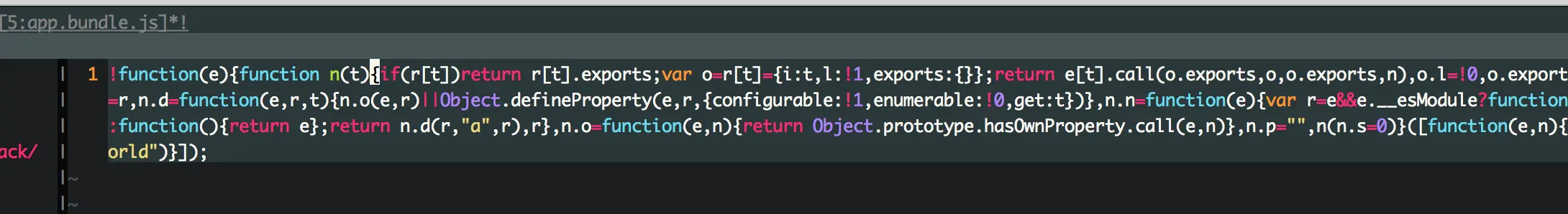 之前转化的 app.bundle.js 文件大约有 74 行代码,差不多 2k 多的大小,好大啊,毕竟我们的代码只有一行而已。
