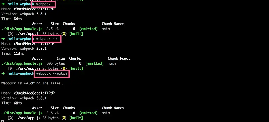 直接在终端上输入 webpack 就可以了。webpack 命令会去找 webpack.config.js 文件,并读取它的内容(源文件和目标文件),最后进行相应的处理。