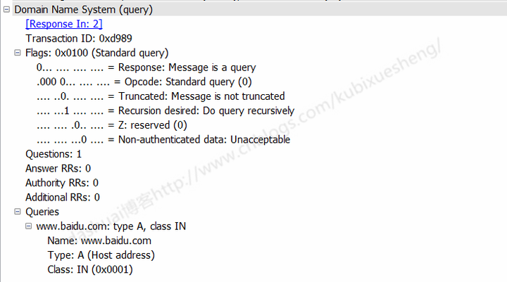 从左到右为:QR,操作代码op,AA,TC,RD,RA,Z,响应代码