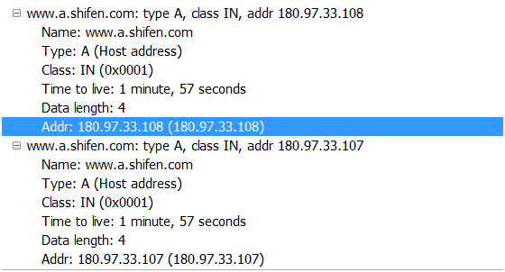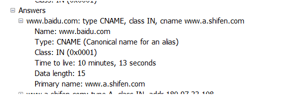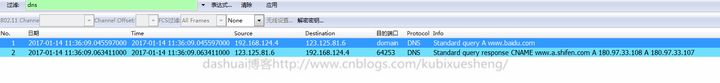如图,第一行是DNS查询报文,第二行是DNS回答报文。