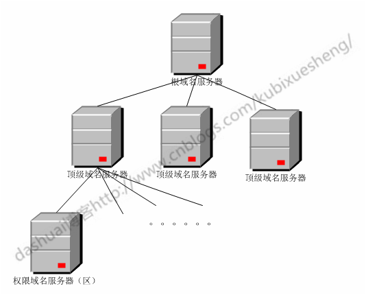 DNS服务器也是类似域名空间树一样的树结构,依次分为根域名服务器(知道所有的顶级域名服务器的域名和IP,最重要,它要是瘫痪,整个DNS就完蛋),然后是顶级域名服务器(管理二级域名),其次是权限域名服务器(负责区的域名服务器)。