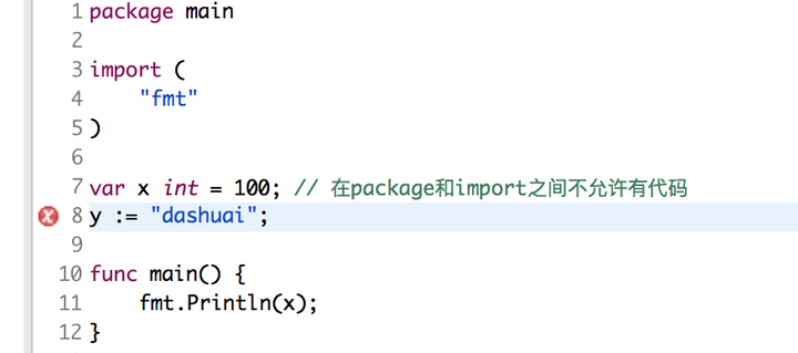 和Java一样,go定义包使用package,导入包使用import,程序入口也是main,函数声明使用func,同Java,Go也需要括号包住函数体,不同的是,语句的结束可以加分号,也可以不加,看个人习惯。比如从Java,C++来的,又是强迫症患者,那么一般都要写分号。如下: