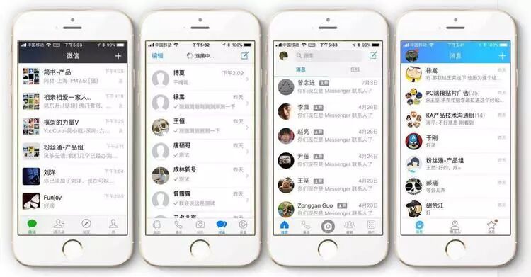 这是全球用户最多的四大即时通讯工具的界面:Facebook Messenger、微信、WhatsApp、QQ,出奇一致的聊天界面显示了他们在争取最广泛人群支持方面的所见略同。事实上,在需要清晰呈现对话的前提下,想把一个短信界面做复杂都是一件困难的事,更何况还是张小龙这样克制的产品经理。
