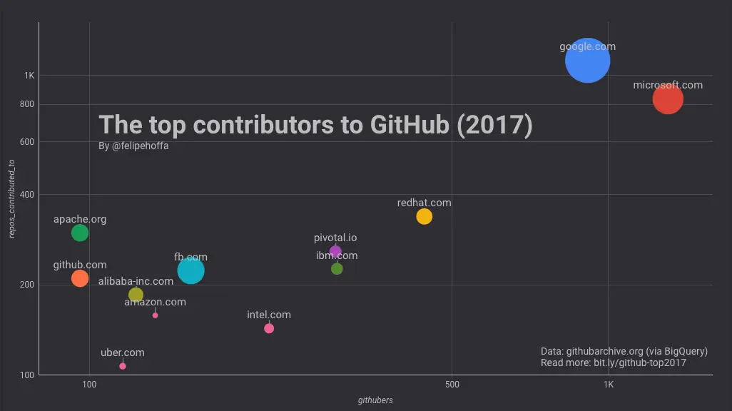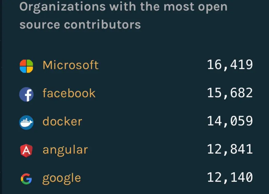 开源无疑是提升公司技术影响力的最好方式,下面图中展示的是 2017 年在 github 上贡献最多的公司,他们无疑已经成为行业技术领域的风向标,只要是他们发布的开源项目大家都会争先使用和参与,同时也会加深对他们产品的喜爱。