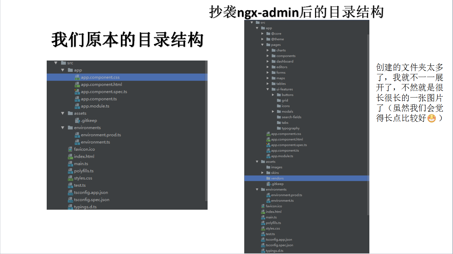 对比一下我们已有的项目结构,和ngx-admin的项目结构,想想有什么不同(就算想不出也没关系,这太正常不过了)。二话不说,先把文件夹建起,里面的文件先不管,当我们用到的时候,再逐一添加,这样好让我们能循序渐进的了解怎么完成这么一个项目。