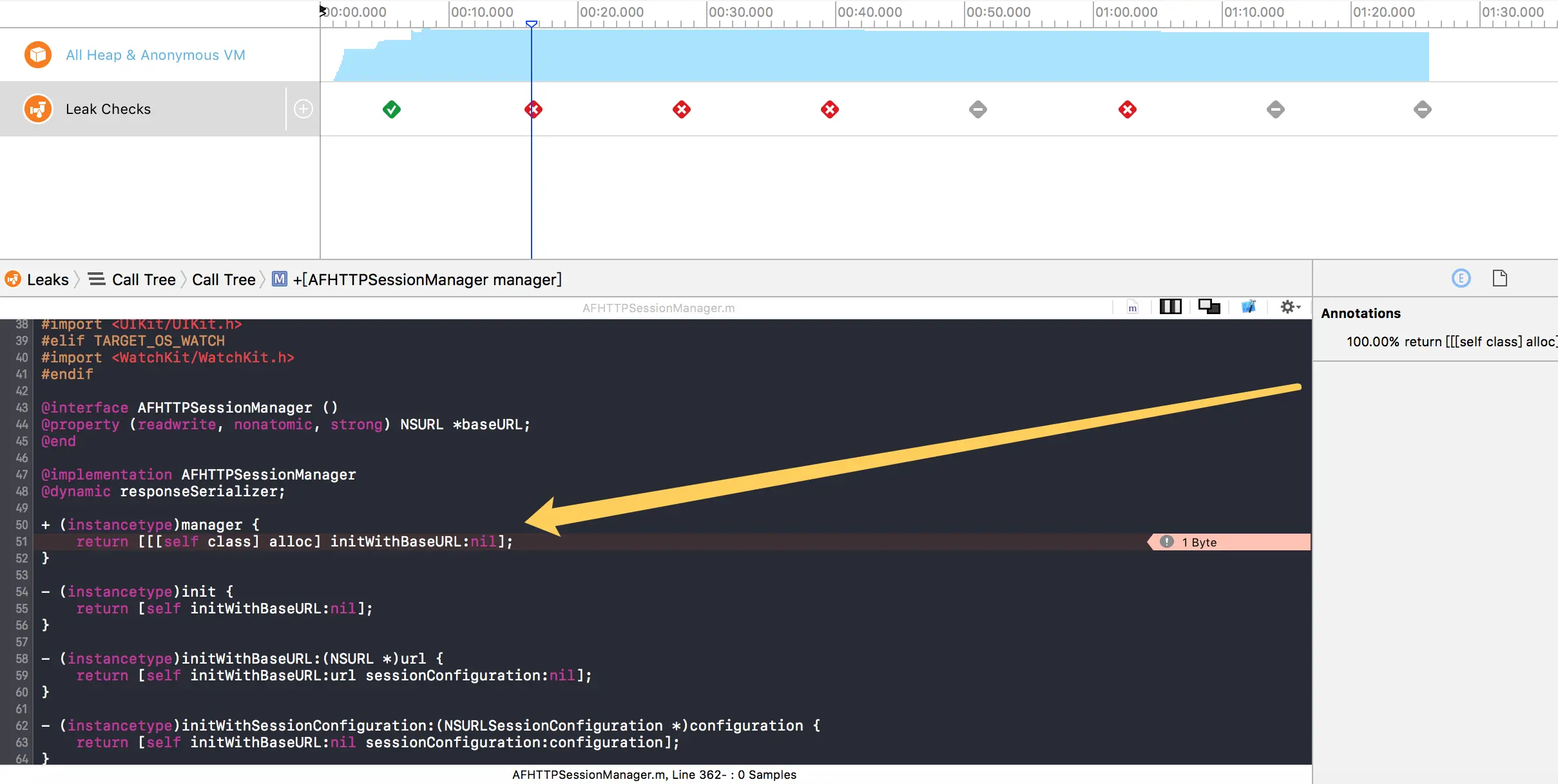 在使用instruments做内存泄漏分析时,发现所有使用如下语句的地方都有内存泄漏,OMG: